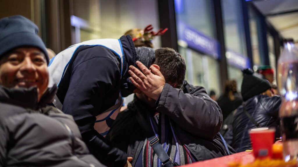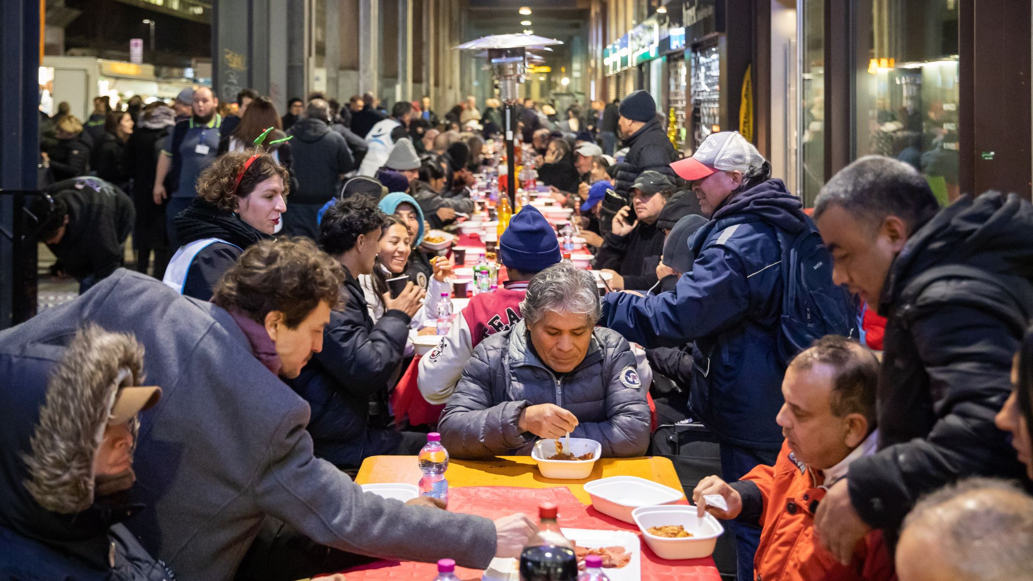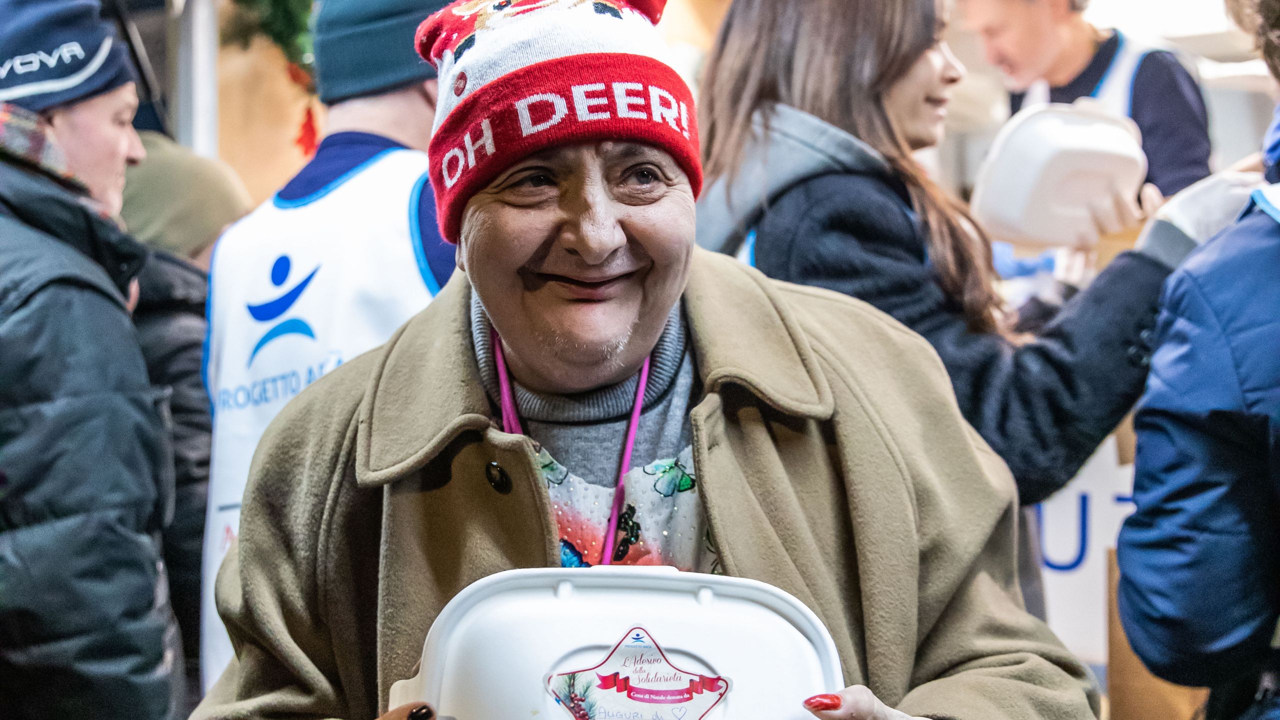 Il menu è quello tipico delle feste: antipasti misti, lasagne in doppia versione – al ragù e alle verdure – torte salate e, immancabile, il panettone. E poi, zaini capienti in dono contenenti guanti, maglie termiche e torce frontali, beni indispensabili per chi vive in strada.