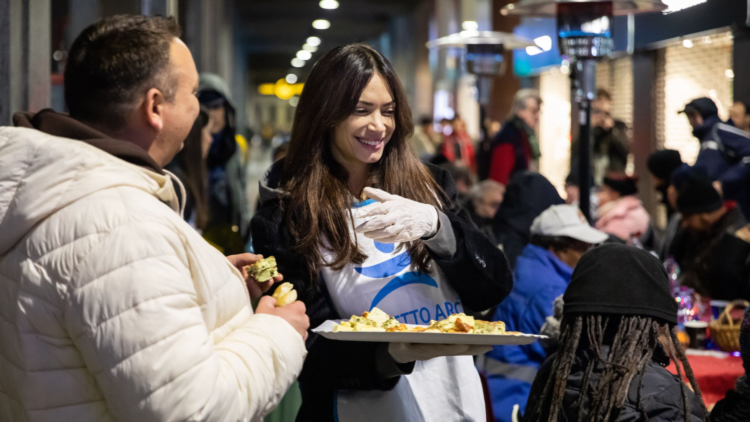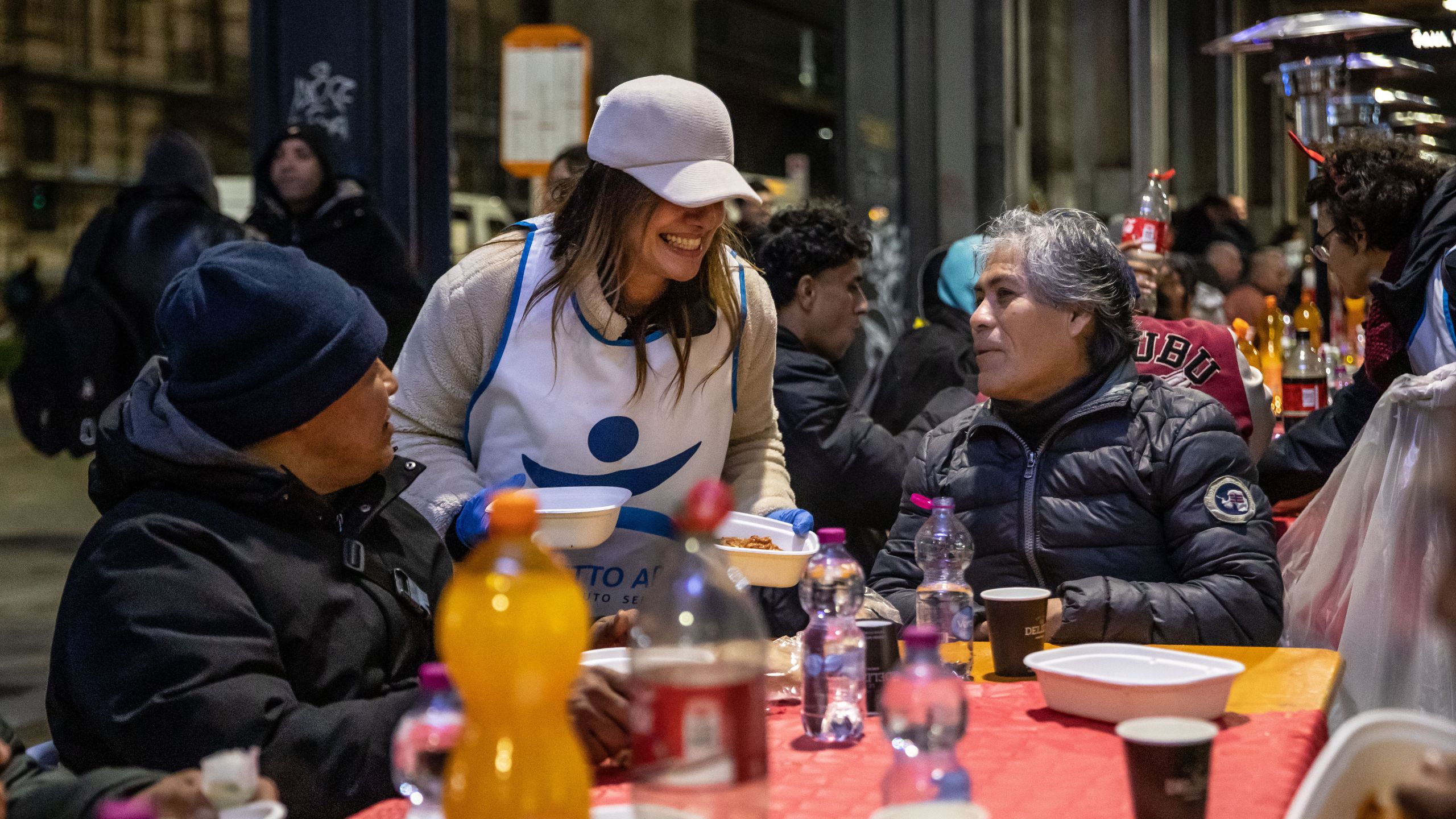 Nelle vesti di camerieri, una ventina di volontari – fra cui l’attore comico Franz e la cantante Elodie – hanno apparecchiato e servito, facendo avanti e indietro dalla Cucina mobile con in mano piatti fumanti e un sorriso aperto per ogni nuovo arrivato che accompagnavano a sedere.