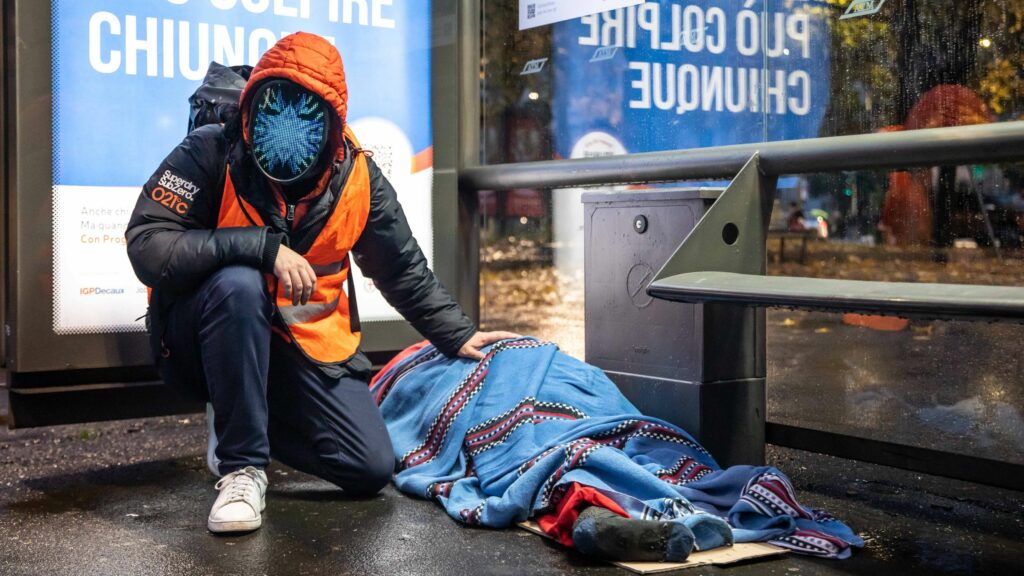Il simbolo per eccellenza della festa e della bontà diventa qui un senzatetto accasciato sotto coperte logore: un’immagine semplice ma potentissima, che racconta la fragilità di chi vive per strada e la perdita di un luogo da chiamare ‘casa’, nel suo significato più umano e affettivo. Se persino Babbo Natale è senza dimora, chi può dirsi davvero al sicuro?“.